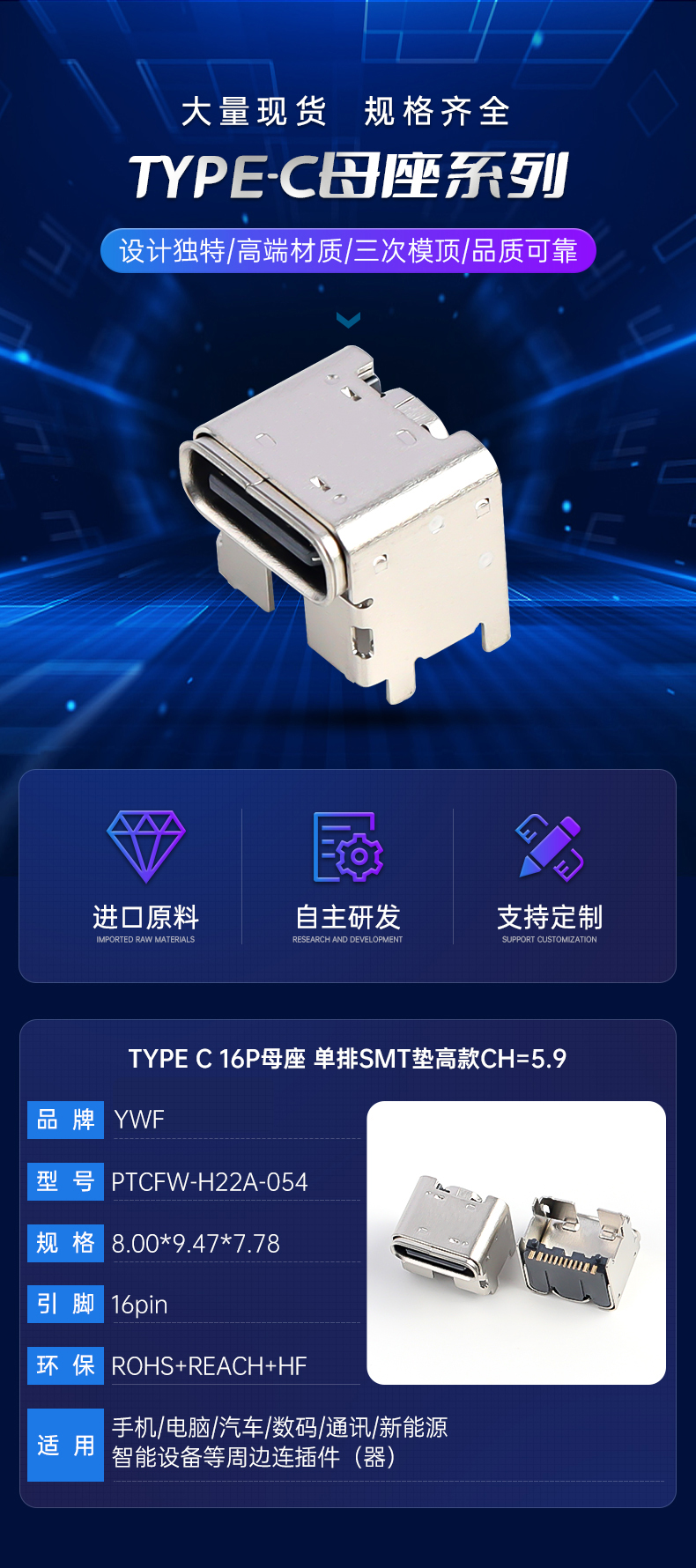 TYPE C 16P母座 单排SMT垫高款 CH=5.9mm