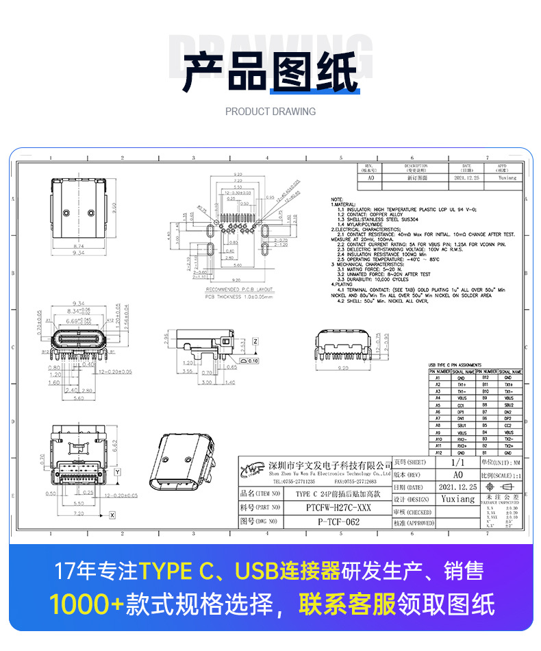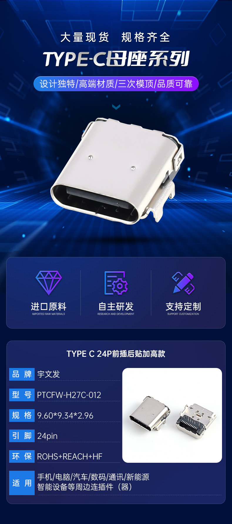 宇文发电子科技有限公司,是一家专业从事TYPEC母座/TYPEC公头、MINIUSB、MICROUSB、USB2.0等系列电子连接器的研发设计、生产制造与销售服务为一体的独资企业。