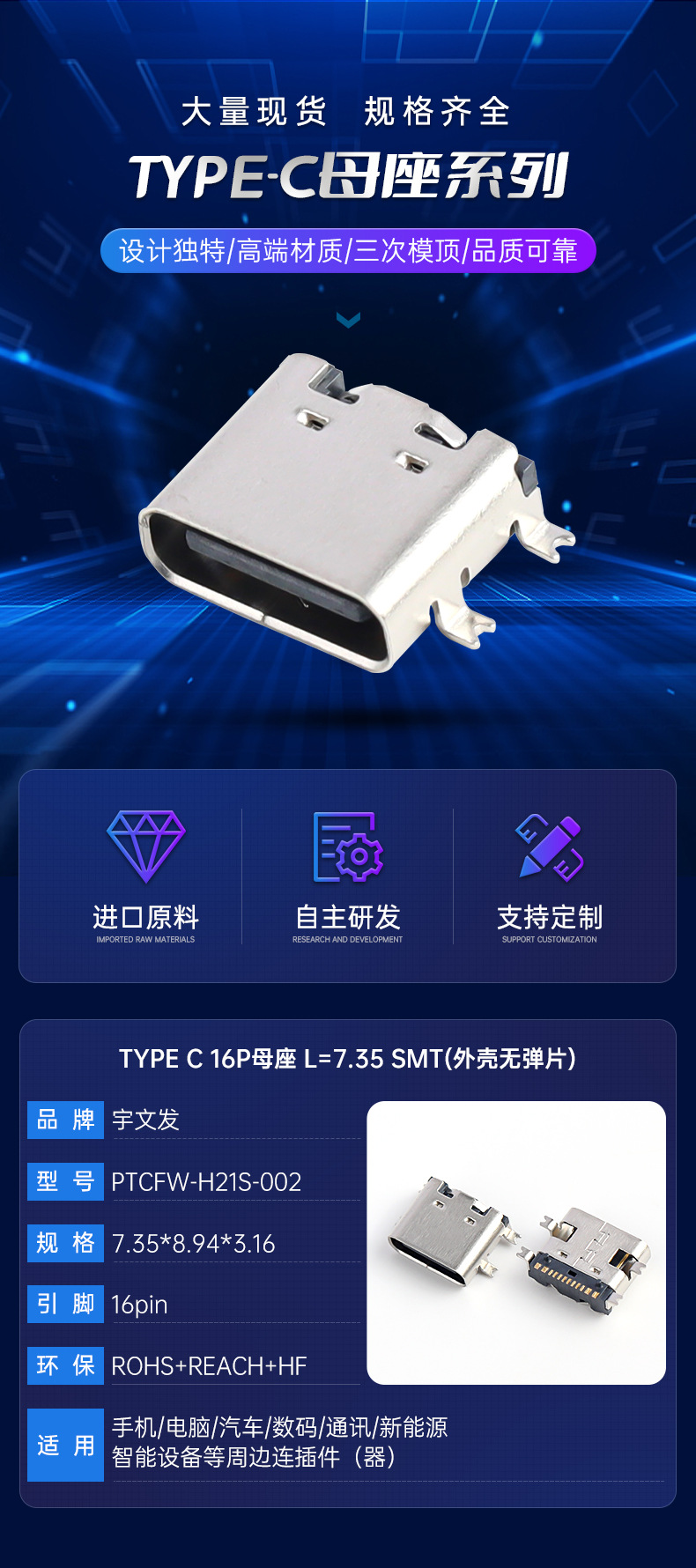TYPE C 母座 16P L=7.35 SMT (全贴款)