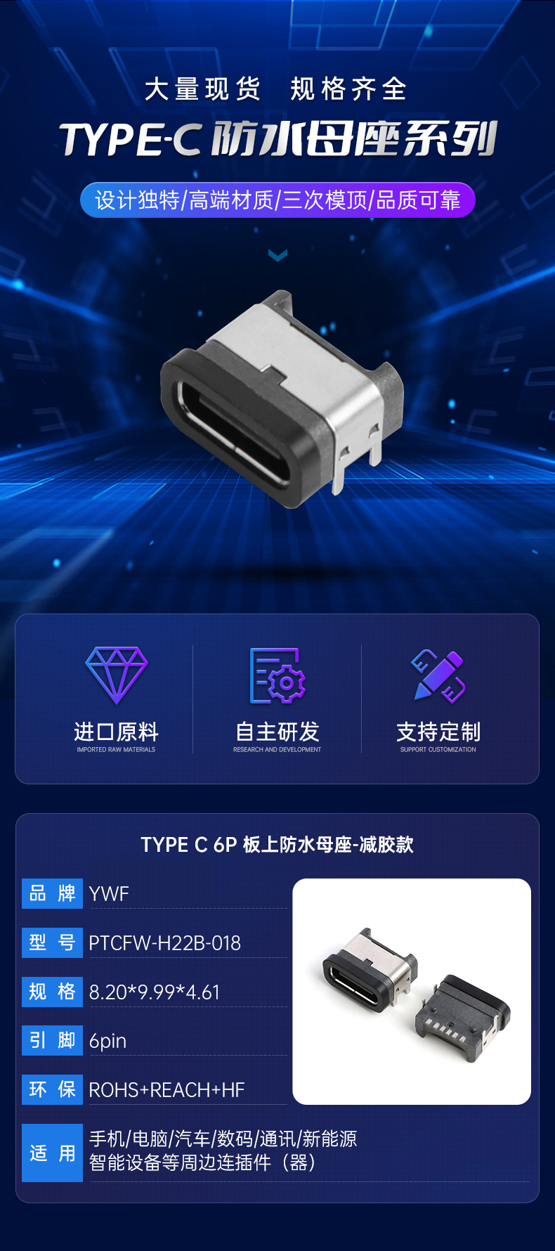 TYPE C 6P 板上防水母座 减胶款