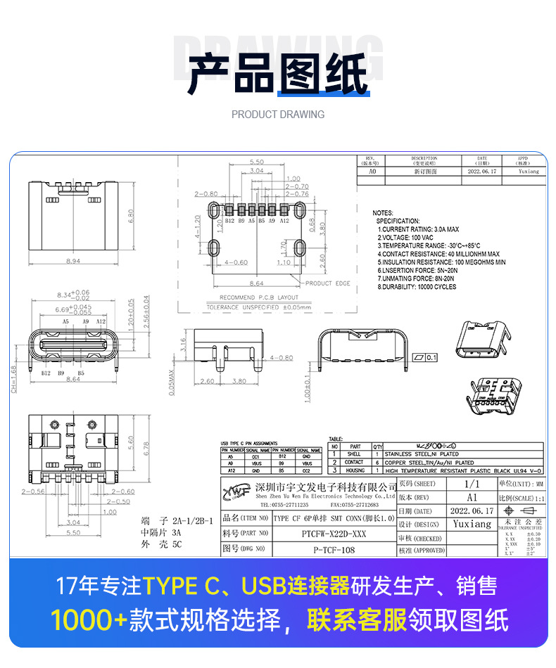 TYPE C母座 6P单排 CONN 脚长1.0