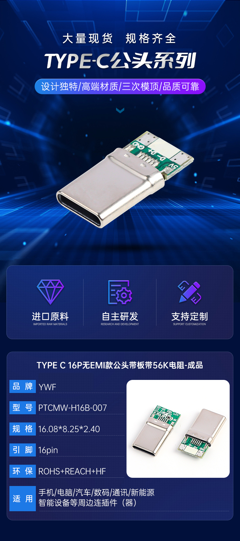 TYPE C 16P 无EMI款公头带板 带56K电阻-成品