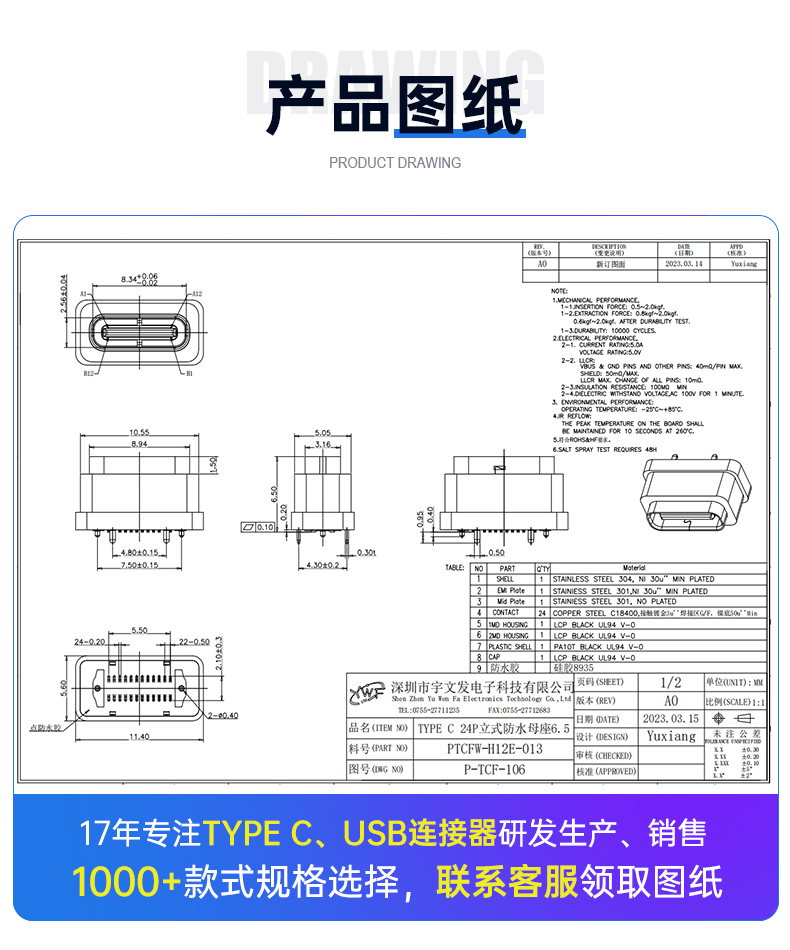 宇文发电子科技有限公司,是一家专业从事TYPEC母座/TYPEC公头、MINIUSB、MICROUSB、USB2.0等系列电子连接器的研发设计、生产制造与销售服务为一体的独资企业。